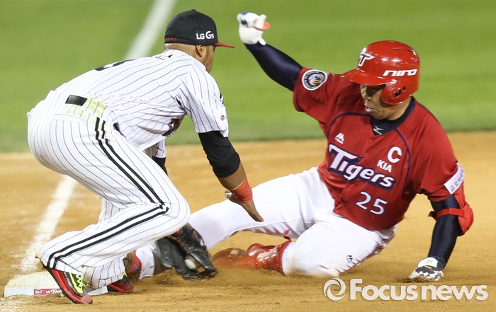(서울=포커스뉴스) 1일 서울 잠실구장에서 열린 2016 프로야구 KIA-LG 경기 8회초 1사 1루에서 KIA 이범호가 중견수를 넘기는 1타점 2루타를 치고 3루까지 뛰다 아웃되고 있다.
