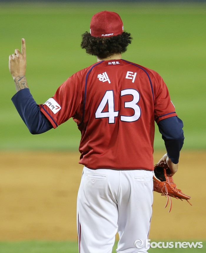 (서울=포커스뉴스) 1일 서울 잠실구장에서 열린 2016 프로야구 KIA-LG 경기에서 KIA 투수 헥터가 7회말 2사후 연속 안타를 맞은후 덕아웃을 향해 '한 타자만 더' 사인을 보내고 있다.