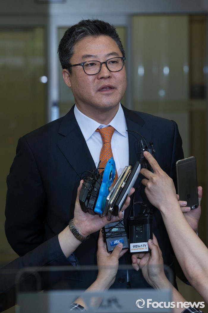 (서울=포커스뉴스)김정범 현대상선 비상경영실장이 2일 오후 서울 종로구 현대상선 본사에서 열린 'G6' 해운동맹 회원사 협렵방안 회의가 끝난 뒤 결과를 설명하고 있다.