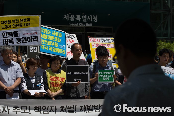 (서울=포커스뉴스) 2일 오전 서울 중구 서울시청 정문 앞에서 '서울시 지하철 하청노동자 사망재해 해결을 위한 시민대책위원회(가칭)'가 지하철 2호선 구의역 사고에 대한 책임자 처벌과 대책마련을 촉구하며 기자회견을 하고 있다.