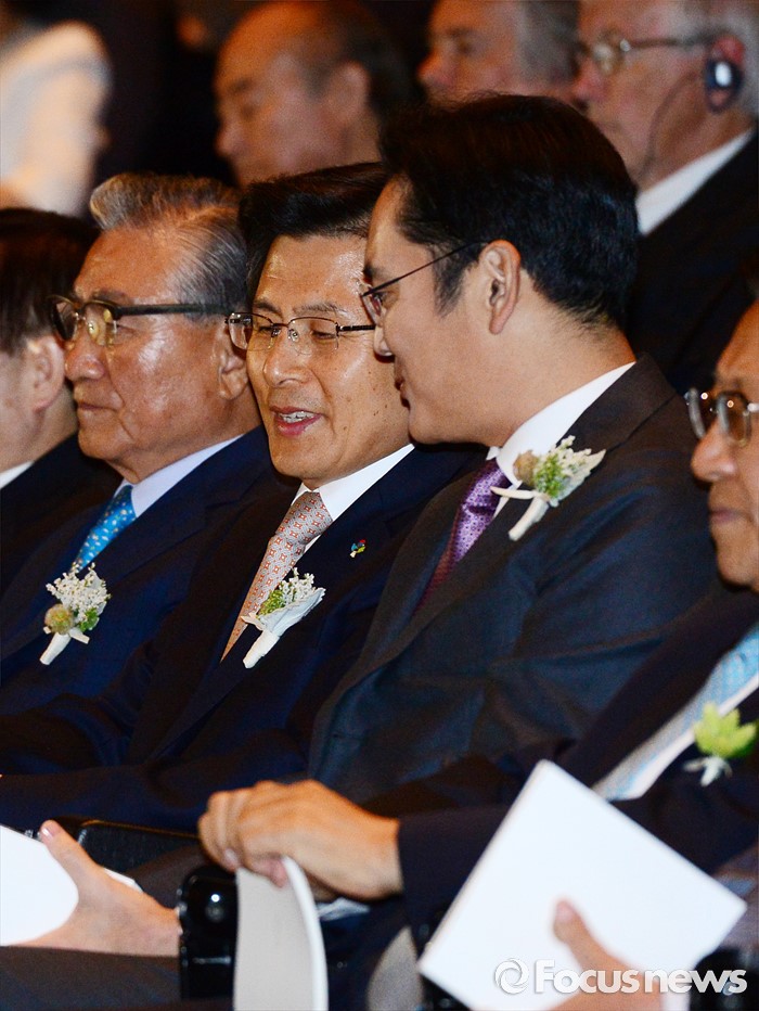 (서울=포커스뉴스) 1일 오후 서울 중구 호암아트홀에서 열린 제26회 호암상 시상식에 참석한 황교안(왼쪽) 국무총리와 이재용 삼성전자 부회장이 대화하고 있다.