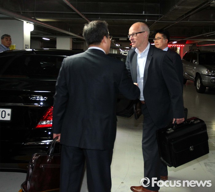 (서울=포커스뉴스) 2일 오후 서울 종로구 현대상선 본사에서 열린'G6' 해운동맹 회원사 협렵방안 회의에 참석한 제3 글로벌 해운동맹 디 얼라이언스 소속 해외 선사 관계자들이 회의를 마친 뒤 주차장으로 향하고 있다.