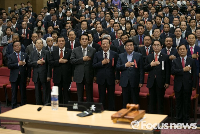 (서울=포커스뉴스) 2일 오후 서울 여의도 국회 의원회관에서 열린 새누리당 4차 전국위원회에 참석한 정진석 원내대표, 서청원 전 최고위원, 원유철 전 원내대표 등 전국위원들이 국기에 대한 경례를 하고 있다.
