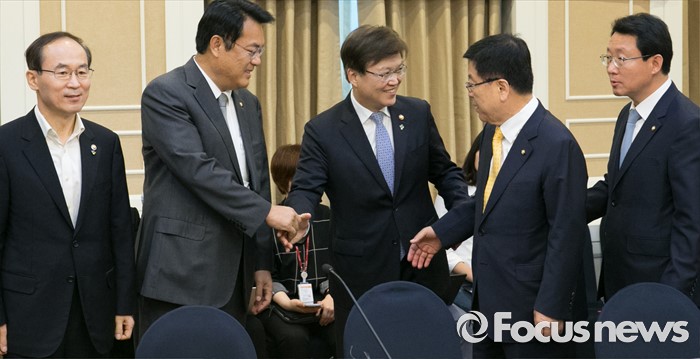 (서울=포커스뉴스) 2일 오전 서울 여의도 국회 귀빈식당에서 열린 미세먼지 대책 관련 당정협의에 참석한 의원들과 장관들이 인사하고 있다. 왼쪽부터 윤성규 환경부 장관, 정진석 새누리당 원내대표, 최양희 미래창조과학부 장관, 김광림 정책위의장, 김상훈 의원.