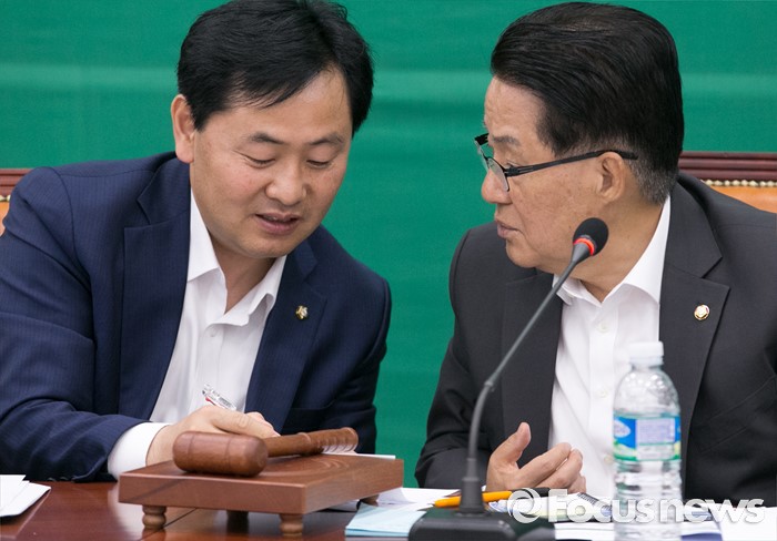 (서울=포커스뉴스) 2일 오전 서울 여의도 국회에서 열린 국민의당 원내정책회의에 참석한 박지원(오른쪽) 원내대표와 김관영 원내수석부대표가 대화하고 있다.