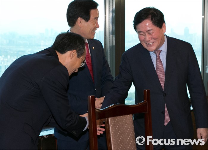 (서울=포커스뉴스) 최경환(오른쪽) 새누리당 의원이 2일 오후 서울 여의도 한 중식당에서 열린 20대 총선 대구지역 당선 의원들과의 오찬에 참석해 추경호(왼쪽), 곽대훈 의원과 인사하고 있다. 이날 오찬에는 곽대훈, 곽상도, 윤재옥, 정태옥, 추경호 의원 등이 참석했다.