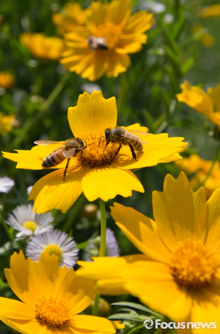 (충주=포커스뉴스) 2일 오후 충북 충주시 장성리 철도주변에 핀 금계국에서 꿀벌이 꽃가루를 채취하고 있다.