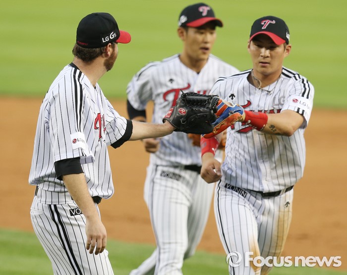 (서울=포커스뉴스) 1일 서울 잠실구장에서 열린 2016 프로야구 KIA-LG 경기에서 LG 투수 코프랜드가 3회 수비를 마치고 들어오는 유격수 오지환과 글러브를 마주치고 있다.