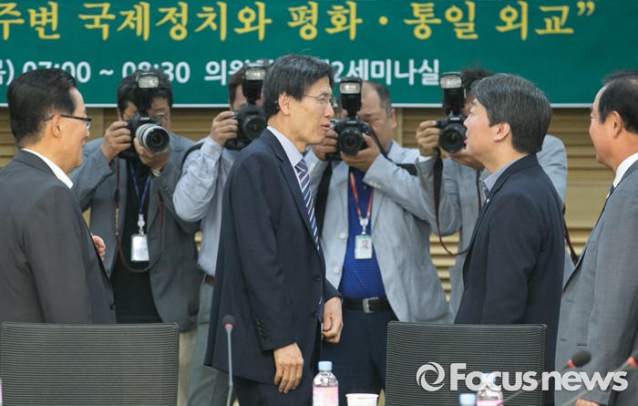 (서울=포커스뉴스) 2일 오전 서울 여의도 국회 의원회관에서 열린 국민의당 정책역량강화 집중 워크숍에 참석한 안철수 상임공동대표가 강연자로 나선 윤영관 전 외교통상부 장관과 대화하고 있다. 왼쪽부터 박지원 원내대표, 윤 전 장관, 안 대표, 장병완 의원.