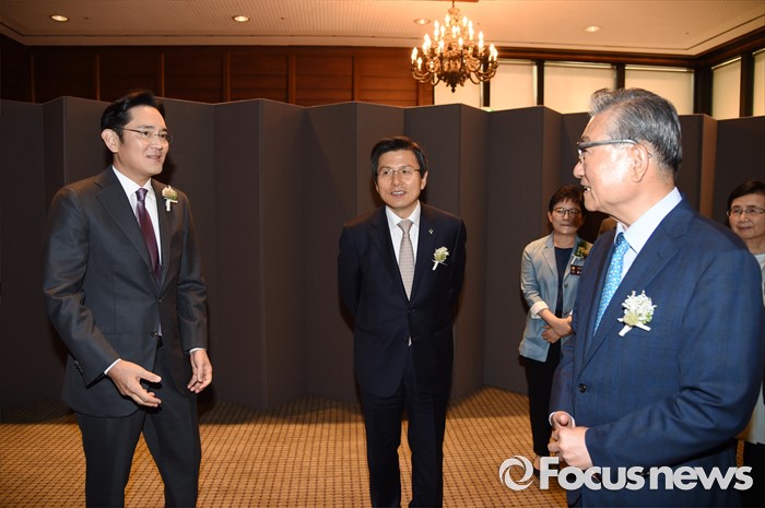 (서울=포커스뉴스) 1일 오후 서울 중구 호암아트홀에서 열린 제26회 호암상 시상식에 참석한 이재용(왼쪽부터) 삼성전자 부회장, 황교안 국무총리, 손병두 호암재단 이사장이대화하고 있다.