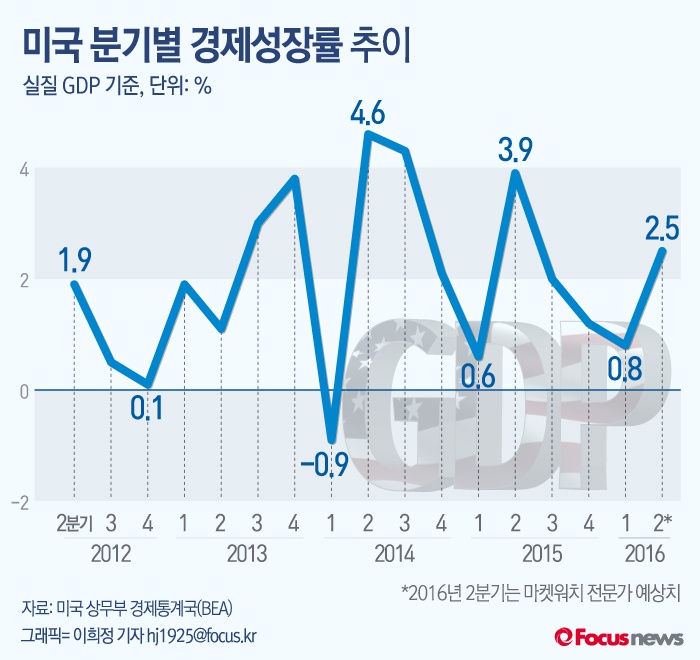 (서울=포커스뉴스)5월28일 미국 상무부는 올 1분기 성장률 수정치를 0.8%로 발표했다. 지난 2015년에도 GDP 성장률은 연간 2.4%인 데 반해 1분기는 0.6%에 머물렀다.