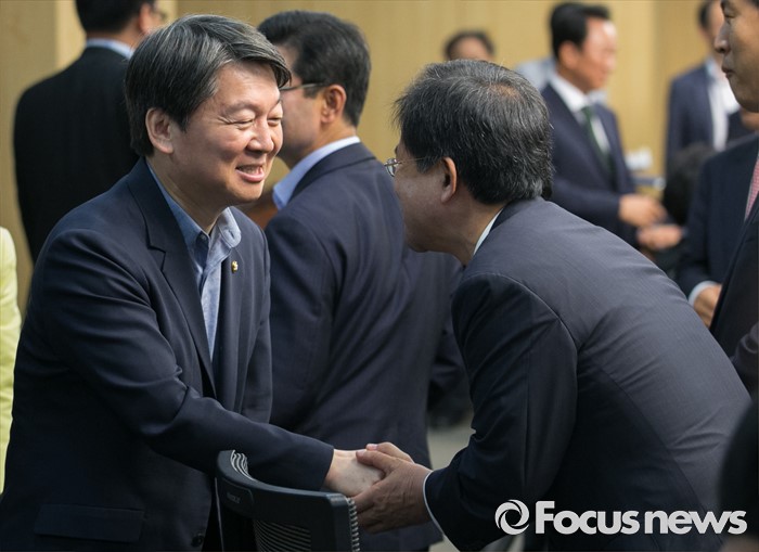 (서울=포커스뉴스) 2일 오전 서울 여의도 국회 의원회관에서 열린 국민의당 정책역량강화 집중 워크숍에 참석한 안철수(왼쪽) 상임공동대표가 의원들과 인사하고 있다.