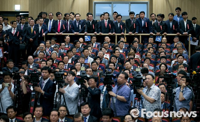 (서울=포커스뉴스) 2일 오후 서울 여의도 국회 의원회관에서 열린 새누리당 4차 전국위원회에 참석한 전국위원들이 정진석 원내대표의 인사말을 듣고 있다.