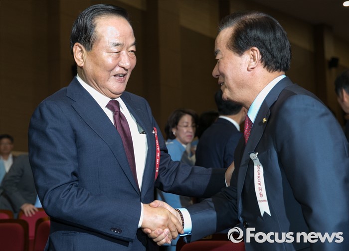 (서울=포커스뉴스) 2일 오후 서울 여의도 국회 의원회관에서 열린 새누리당 4차 전국위원회에 서청원(왼쪽) 전 최고위원과 정갑윤 신임 전국위의장이 악수하고 있다.