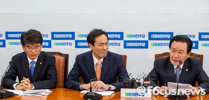 (서울=포커스뉴스) 변재일(오른쪽) 더불어민주당 정책위의장이 2일 오전 서울 여의도 국회에서 열린 정책조정회의에 참석해 모두발언 하고 있다.