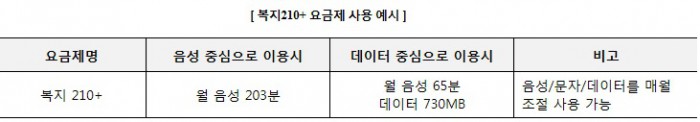 아울러 SK텔레콤은 복지요금제의 가입 범위를 3G폰 전용에서 3G·LTE폰 모두 가입이 가능하도록 확대했다. 복지요금제의 음성·데이터 기본 제공량을 모두 소진하면 발신 및 데이터 사용이 자동으로 차단돼, 스마트폰 조작 미숙에 따른 추가 요금 발생 우려도 줄였다.복지210+ 요금제의 혜택 확대 내용.<표제공=SK텔레콤>