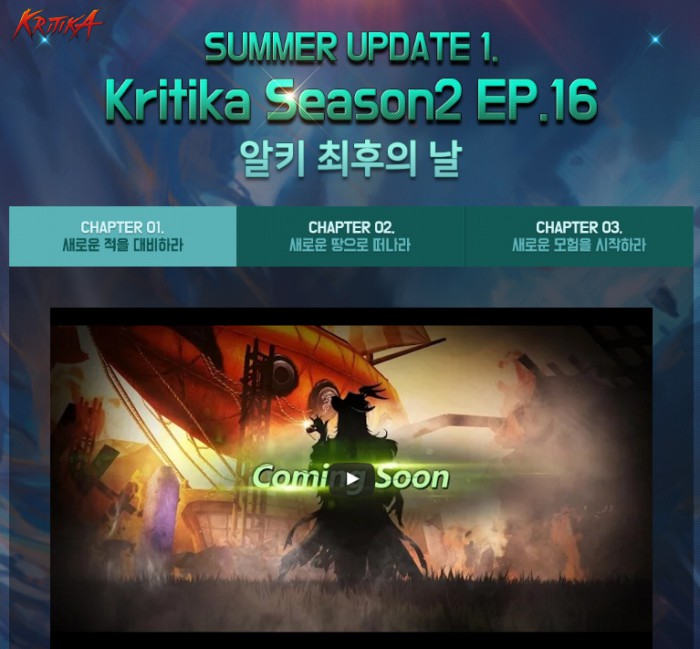 크리티카의 이번 여름 대규모 업데이트 '새로운 시대, 파멸의 땅'은 '새로운 적을 대비하라', '새로운 땅으로 떠나라', '새로운 모험을 시작하라' 등 3가지 챕터로, 티저 페이지(www.kritika.com/Gate/160526_Season3)를 통해 순차적으로 공개할 예정이다.