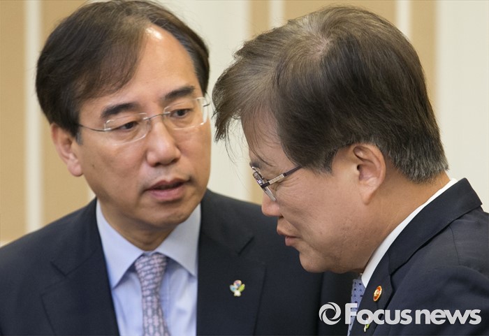 (서울=포커스뉴스) 2일 오전 서울 여의도 국회 귀빈식당에서 열린 미세먼지 대책 관련 당정협의에 참석한 최양희(오른쪽) 미래창조과학부 장관과 이석준 국무조정실장이 대화하고 있다.