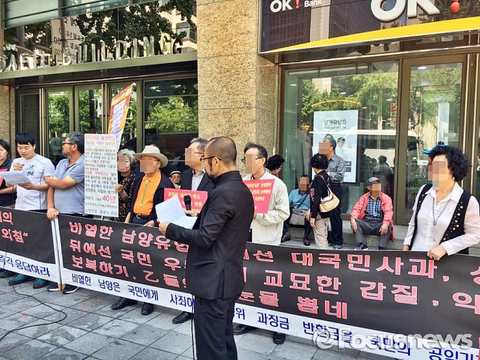 이 사회의 ‘을’들이 정당한 권리를 주장하기 위해서는, 남양유업 사태를 을의 보상요구가 아닌 본사의 진정한 반성 여부에 초점을 맞춰야 하지 않을까.2일 오전 서울 중구 남양유업 본사가 있는 대일빌딩 앞에서 이창섭 옛 남양유업 피해자협의회 회장(맨 왼쪽)과 어르신들이 시위를 하고 있다.2016.06.02 이서우 기자 buzacat@focus.co.kr