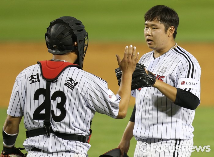 (서울=포커스뉴스) 2일 서울 잠실구장에서 열린 2016 프로야구 KIA-LG 경기에서 KIA를 물리치고 승률 5할에 복귀한 LG의 투수 이승현과 포수 최경철이 하이파이브하고 있다.