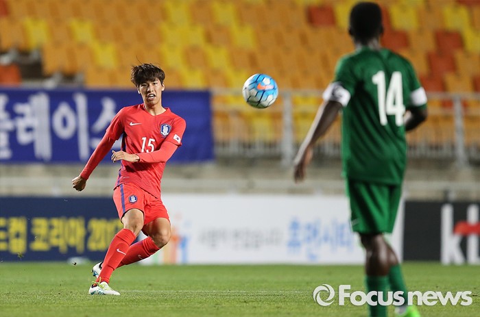 (수원=포커스뉴스) 2일 오후 경기 수원월드컵경기장에서 열린 2016 4개국 올림픽국가대표 축구대회 대한민국과 나이지리아의 경기에서 대한민국 최규백이 프리킥을 차고 있다.