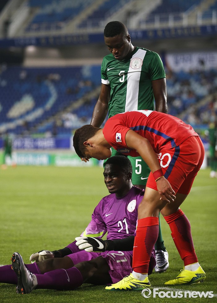 (수원=포커스뉴스) 2일 오후 경기 수원월드컵경기장에서 열린 2016 4개국 올림픽국가대표 축구대회 대한민국과 나이지리아의 경기에서 대한민국 황희찬이 나이지리아 데니얼 임마누엘 신쿳을 걱정하고 있다.