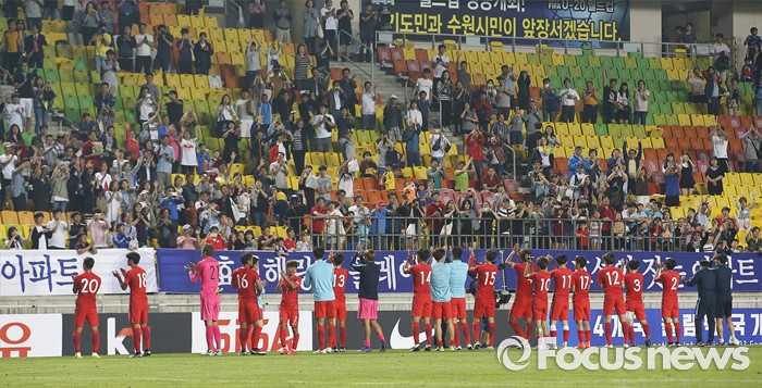 (수원=포커스뉴스) 2일 오후 경기 수원월드컵경기장에서 열린 2016 4개국 올림픽국가대표 축구대회 대한민국과 나이지리아의 경기에서 대한민국 선수들이 경기가 끝난 후 관중들에게 인사하고 있다.
