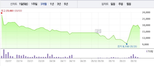 가장 어려운 부분이었던 용선료 협상도 빛을 보고 있음에 따라 이제 해운동맹 가입에 관심이 쏠리고 있다. 현대상선은 외국 해운사들을 만나 해운동맹 가입을 위해 나설 계획이다.주가흐름<사진출처=네이버 캡쳐>