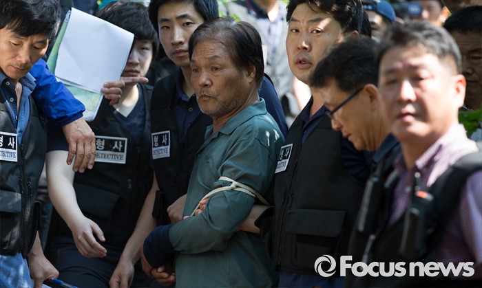 (서울=포커스뉴스) 지난 29일 서울 노원구 수락산 등산로에서 60대 여성을 살해한 피의자 김학봉(61)이 3일 오전 범행장소에 도착해 현장검증을 준비하고 있다.