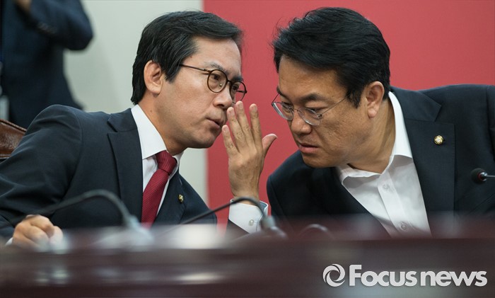 (서울=포커스뉴스) 정진석 새누리당 원내대표와 김영우 비대위원이 3일 오전 서울 여의도 새누리당 당사에서 열린 비상대책위원회의에 참석해 대화하고 있다.