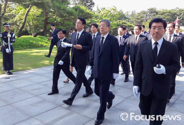 (서울=포커스뉴스) 김희옥 새누리당 혁신비대위원장과 정진석 원내대표 등이 3일 오전 동작구 국립서울현충원을 방문해 참배를 위해 이동하고 있다.
