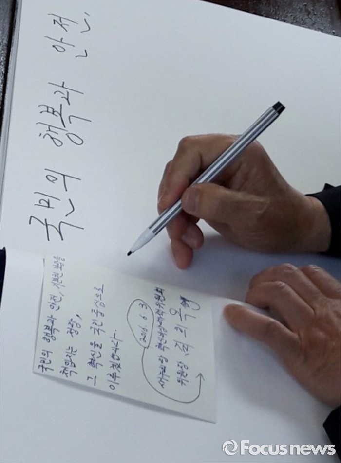 (서울=포커스뉴스) 김희옥 새누리당 혁신비대위원장이 3일 오전 동작구 국립서울현충원을 방문해 참배 후 방명록을 작성하고 있다.