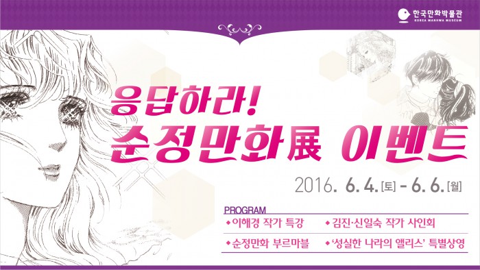 '응답하라! 순정만화전'에서는 이혜경 작가 특강, 김진·신일숙 작각 사인회, 페이스페인팅, 영화 '성실한 나라의 앨리스' 상영 등 행사가 마련됐다. 순정만화 관련 퀴즈를 맞히면 기념품을 주는 '순정만화 부루마블', 만화책을 할인가에 판매하는 '도서마켓' 등도 열린다.한국만화박물관이 4일부터 6일까지 순정만화가 특강, 사인회, 페이스페인팅, 영화 상영 등 다양한 순정만화 관련 행사를 연다. 사진은 행사 포스터. <사진제공=한국만화박물관>