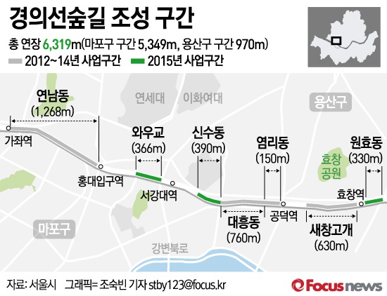 경의선숲길은 경의선철도 폐선부지를 활용해 조성한 선형공원으로 지난달 개장했다. 특히 경의선숲길의 연남동 구간은 미국 뉴욕의 센트럴파크를 빗대 '연트럴파크'라고 불릴 정도로 시민들의 호응도가 높다.