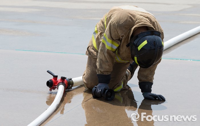 (청주=포커스뉴스) 3일 오전 충북 청주 무심천시민체육공원에서 열린 충북소방기술경연대회에 참가한 소방대원들이 실수를 하자 안타까워하고 있다.