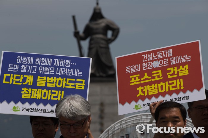 (서울=포커스뉴스) 3일 오전 서울 종로구 광화문광장에서 건설산업연맹원들이 남양주 지하철 폭발 및 붕괴사고에 대해 책임자 처벌과 건설현장 안전문제 대책 마련을 촉구하며 기자회견을 하고 있다.