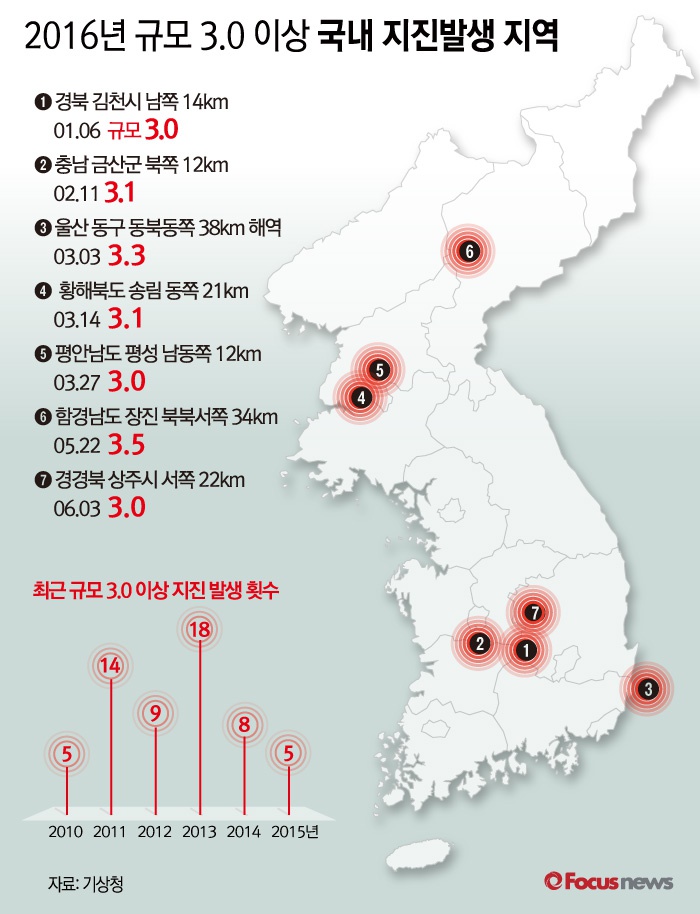 (서울=포커스뉴스) 3일 오전 경북 상주에서 지난 3월 규모 2.7의 지진 발생한 이후 또다시 규모 3.0의 지진이 발생했다. 기상청 자료를 보면 올해 국내에서 발생한 규모 3.0 이상의 지진은 7회로 한반도 전역에 지진에 대한 불안감이 높아지고 있다.