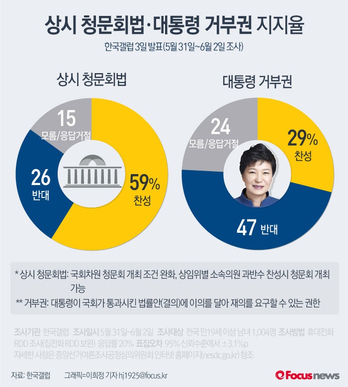 (서울=포커스뉴스) 한국갤럽이 3일 발표한 6월1주차 여론조사 결과에 따르면 국회법 개정안(일명 '상시 청문회법')과 관련해 여론조사 응답자들의 59%는 해당 법안의 취지에 대해 찬성했다. 박근혜 대통령의 거부권 행사에 대해서는 '잘못한 일'이라고 평가한 응답자가 47%로 나타나 '잘한 일'이라고 평가한 응답자(29%)보다 압도적인 수치를 기록했다.