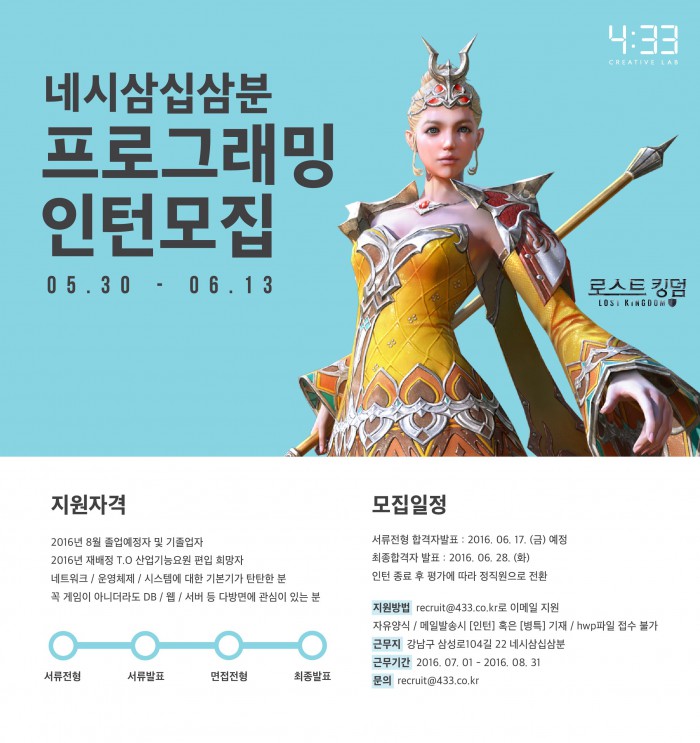 한편 4:33은 게임 콘텐츠와 다양한 뉴미디어 콘텐츠를 개발하고 퍼블리싱 하는 모바일게임 선도기업이다. 2009년 설립돼 현재까지 '활 for Kakao', '영웅 for Kakao', '로스트킹덤' 등 유수의 게임 콘텐츠를 선보였으며, 특히 '블레이드 for Kakao'는 모바일게임 최초로 대한민국 게임대상을 수상했다.네시삼십삼분, 프로그래밍 인턴·산업기능요원 공개 모집