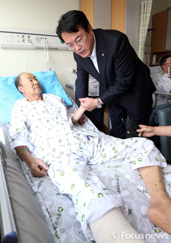 (서울=포커스뉴스) 정진석 새누리당 원내대표가 현충일을 사흘 앞둔 3일 오후 서울 강동구 중앙보훈병원을 방문해 DMZ지뢰로 발목을 다쳤던 환자를 위문하고 있다.