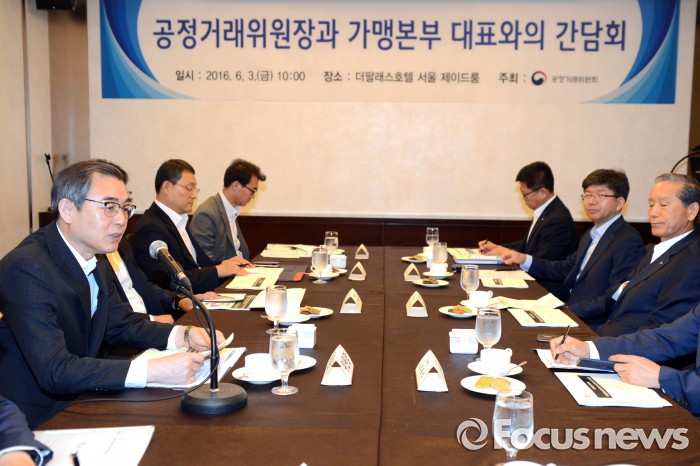 CJ푸드빌 관계자는 “가맹분야 최초로 시도한 공정거래협약이 가맹점주들에게 좋은 반응을 얻어 기쁘다”며 “앞으로도 협약내용을 성실하게 이행하고 점주들과 동반 성장할 수 있도록 하겠다”고 말했다.3일 정재찬 공정거래위원장이 서울 팔래스호텔에서 파리크라상(파리바게뜨), CJ푸드빌(뚜레주르), 롯데리아, GS리테일(GS25), 비지에프리테일(CU), 코리아세븐(세븐일레븐), 한국미니스톱, 한국인삼공사(정관장) 등 8개 대형 가맹본부 대표들과 간담회를 진행하고 있다. <사진=공정거래위원회> 2016.06.03 이규하 기자