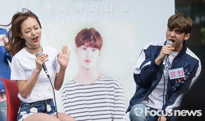 (서울=포커스뉴스) 3일 오후 서울 광진구 건대입구 스타시티 광장에서 가수 김소희(왼쪽)와 송유빈이 거리공연을 하고 있다.