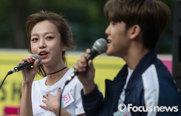 (서울=포커스뉴스) 3일 오후 서울 광진구 건대입구 스타시티 광장에서 가수 김소희(왼쪽)와 송유빈이 거리공연을 하고 있다.
