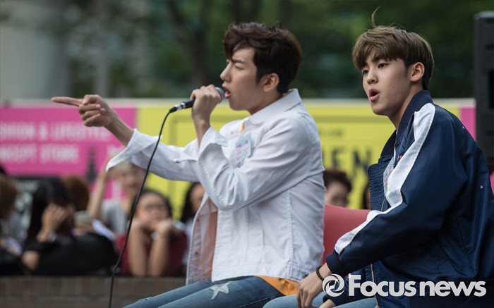 (서울=포커스뉴스) 3일 오후 서울 광진구 건대입구 스타시티 광장에서 가수 송유빈(오른쪽)이 거리공연을 하고 있다.