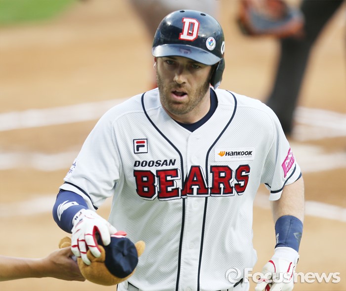 (서울=포커스뉴스) 3일 서울 잠실구장에서 열린 2016프로야구 SK-두산 경기 2회말 두산 에반스가 좌월 솔로 홈런을 치고 홈인하고 있다.