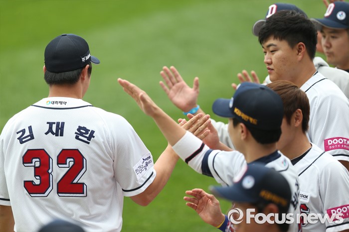 (서울=포커스뉴스) 3일 서울 잠실구장에서 열린 2016프로야구 SK-두산 경기에 앞서 열린 KBO 5월 MVP에 선정된 두산 김재환을 동료 선수들이 축하하고 있다.
