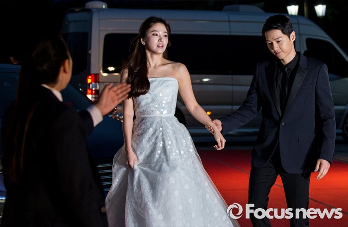 (서울=포커스뉴스) 3일 오후 서울 동대문구 경희대학교 평화의전당에서 열린 '2016 백상예술대상'에 참석한 배우 송중기-송혜교가 레드카펫을 밟고 있다.