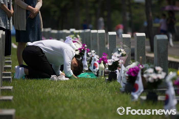 (서울=포커스뉴스) 현충일을 하루 앞둔 5일 오전 서울 동작구 국립서울현충원을 찾은 유족들이 묘역에 참배하고 있다.