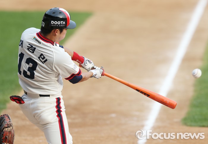 (서울=포커스뉴스) 5일 서울 잠실구장에서 열린 2016프로야구 SK-두산 경기 2회말 2사 1루에서 두산 허경민이 좌익수 왼쪽에 떨어지는 적시 2루타를 날리고 있다.