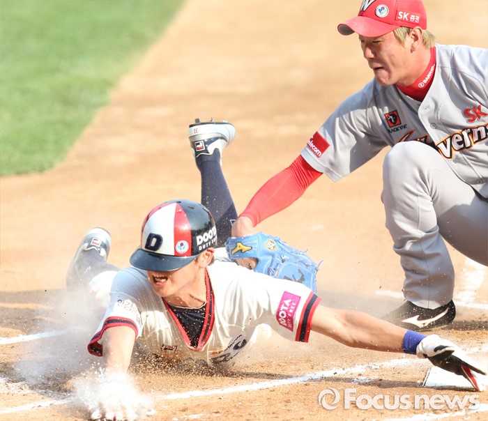 | △ 실책을 틈타 홈을 파고드는 두산 정수빈 |